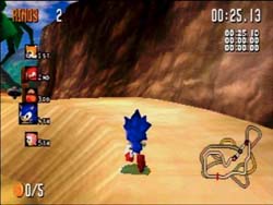 Vamos à função dos itens, retirada em sua maioria de Sonic antigos: a bolha, para atravessar áreas aquáticas, que infelizmente expira após uma só utilização; o escudo magnético, que puxa anéis; abastecedores de anéis (o que eles fazem está mais do que óbvio); e o tênis, para aumentar a top speed. Esclarecemos que os anéis não têm função de aumentar a resistência em Sonic R, mas servirão para “comprar” coisas durante as corridas, como passagens secretas ou becos com muitos itens, por exemplo. Há moedas especiais, em determinado modo, que quando coletadas (e desde que o personagem termine, ainda assim, entre os três primeiros) em sua totalidade, destravam um confronto entre o jogador e o personagem “x”: é vencendo essas corridas 1 contra 1 que os velocistas secretos são habilitados (nisso o jogo se parece mais com Diddy Kong Racing). Há até mesmo Esmeraldas do Caos escondidas por aí, como em qualquer outro Sonic de ação. O prêmio final só podia mesmo ser o Super Sonic, isto é, a versão turbinada do próprio protagonista (desnecessário dizer que o cara é o supra-sumo da agilidade).