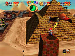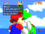 A clássica estrela de invencibilidade foi multiplicada por 120, mas perdeu sua função: agora, ela é como o mastro de Mario 1, é o objetivo final do jogador cada vez que ele liga o videogame. Pelo menos o protagonista ainda vai quebrar alguns bloquinhos e amassar alguns goombas! Haverá mais conversas na tela, mas nada que equipare este Mario minimamente a um RPG. Os profissionais da Nintendo foram bem cuidadosos com a questão dos comandos, espalhando tutoriais sobre como proceder para avançar no jogo, em forma de plaquinhas de fácil leitura. Devemos lembrar que esta foi a introdução dos gamers a um direcional analógico e ao botão-gatilho, i.e., o “Z” traseiro!