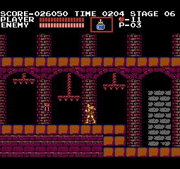 Dessa vez sendo mais direto e menos elíptico, reza a lenda que há dois tipos de adversários em Castlevania: 1) os lentos e inofensivos – zumbis e cavaleiros armados, encontrados somente nos primeiros estágios, que se dirigem ao herói com o mesmo ímpeto de um paciente geriátrico em seu andador; 2) os frustrantes, porque mais ágeis que o próprio personagem principal – leia-se: todo o resto! Basta mencionar as palavras mágicas “cabeça de Medusa” para o gamer sentir regurgitações estomacais: essas patéticas coisas ziguezagueantes e sem-corpo são capazes de enlouquecer qualquer um ao empurrá-lo num abismo, não importa se Belmont está ou não com a barra de life cheia. O que dizer dos homens-pulgas (eu sempre pensei que fossem macaquinhos)? O chicote de S.B. raramente é páreo para os saltos frenéticos dessas criaturinhas, que também aproveitam qualquer janela para tacar o herói plataformas abaixo – talvez sem volta. Ah, claro, sem mencionar os malditos esqueletos que pensam que estão no circo e que devem receber um trocado do rico Conde por cada osso que arremessam! Supondo que esses ossos fossem retirados do próprio corpo, não restaria nem a espinha dorsal depois de alguns segundos… Belmont tem de desviar de todos os projéteis e contra-atacar em tempo hábil, e devido à lentidão do boneco isso é o mais improvável. De fato, alguns padrões de movimentação dos inimigos, embora manjados após certo período, se tornam problemáticos se houver dois ou três na tela ao mesmo tempo e o jogador tenta combatê-los enquanto, ainda por cima, pula de plataforma precária em plataforma precária! Essa situação vai ficando cada vez mais alarmante, uma vez que nos últimos níveis o dano já se tornou o quádruplo dos aventados na primeira fase. Carne – o único regenerador de HP – é raríssima, embora o excêntrico dono do castelo tenha o hábito de esconder algumas bandejas com frango assado no interior das paredes carcomidas e adornadas com teias de aranha de sua habitação… Pensando bem, para quem só bebe sangue, até que faz sentido! Um pequeno consolo para toda essa ordem de reveses é que o jogador dispõe de infinitos continues para se aventurar nas dependências do castelo, recomeçando da mesma fase em que morreu, quantas vezes for necessário. Uma hora a memória do jogador será capaz de predizer os movimentos de cada besta dos infernos, e seus dedos de se antecipar a seus movimentos, ainda que o chicote ofereça certo lag. Não podemos subestimar, também, a neutralidade da sorte: ora prejudicial, ela pode dar as caras favoravelmente nos momentos mais críticos!