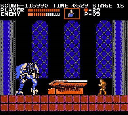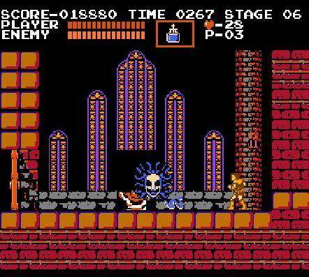 Os oponentes especiais encontrados no fim de cada fase rendem muito assunto, sempre que se fala em Castlevania. O primeiro chefe é um morcego anabolizado – felizmente o jogo lhe dá um machado pouco antes da batalha, o que permite atacar o mamífero alado de baixo e evitar muitos males (vide legenda da foto abaixo para entender o porquê). Há outro guardião de fase bem conhecido, um Frankenstein com um capanga hiperativo às costas, Igor (muitas referências cinéfilas na obra da Konami, afinal!). Mas perto da Dona Morte todos esses parecem distrações bobas e meros brinquedos de Dia das Bruxas: se ela não acabar com a raça do Belmont arremessando seus penduricalhos de certa distância, vai prejudicá-lo de um jeito ou de outro se teleportando para bem próximo com sua foice em riste, pronta para partir-lhe o crânio!