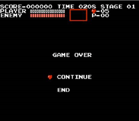 O layout das teclas é muito simples: A pula, B isolado usa o chicote, mas B e para baixo no direcional ao mesmo tempo acionam a sub-weapon que estiver com Belmont no momento (infelizmente ele não pode acumulá-las). A vantagem de ser esse o comando que ativa a arma secundária é que ele é muito fácil (mais fácil até do que se a função fosse designada à tecla Select); a desvantagem é que o comando é, justamente, tão fácil que a segunda arma pode ser ativada sem querer, principalmente em saltos ou descendo lances de escada. E o jogador não quererá desperdiçar projéteis, desde que as armas secundárias são energizadas por corações, que existem em estoque limitado em Castlevania. Corações são coletados via candelabros e inimigos mortos, como dito, servindo como MP (magic points – atenção: nada a ver com o life meter ou HP, hit points!). Todos esses aspectos da mecânica de jogo tornam a gameplay mais complexa do que a de qualquer side-scrolling do período, sagrando Castlevania como o precursor de algo GRANDE – o 1º adventure da História? Cada sub-weapon possui um custo diferente em termos de corações, que varia de 1 a 5. Há ainda outros tipos de itens: os multipliers (números II e III cravados em balões/cápsulas, que permitem arremessos duplos ou triplos de algumas das armas da caixa secundária de item); e as sacolas de dindim – que Conde mais esnobe e pródigo! Fundamentalmente, a grana serve para ampliar sua pontuação total, o que ajuda a ganhar vidas e inflar seu ego.