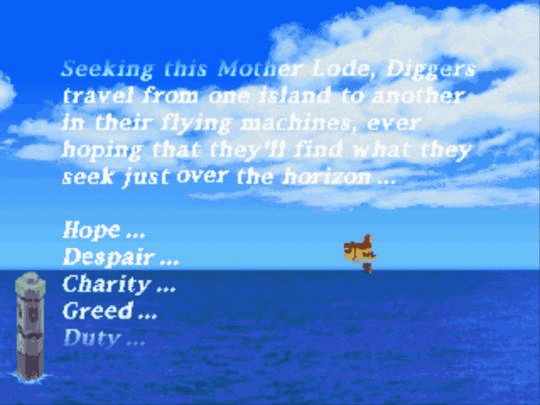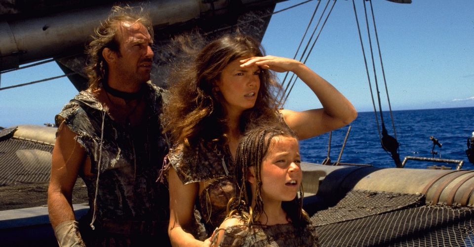 Legends se passa num “mundo banhado por águas infindas” onde as pessoas habitam nas minguadas ilhas da superfície. Ok, essa não é uma estória inédita (inclusive habitantes da Europa medieval tendiam a pensar parecido), mas muito me encanta (Waterworld, alguém? Foto abaixo.). Muitos dos viventes ganham a vida como mineiros, a escavar em cavernas subterrâneas antiquíssimas e ruínas repletas de tesouros, incluindo Refractors, uma estranha fonte de energia, como seria o plutônio em nossa era. Uma coisa não mudou: você ainda é Mega/Rockman, meio-menino, meio-máquina. Ao lado dos NPCs Roll, o avô de Roll e o misterioso macaco-andróide Data, seu objetivo será tanto sobreviver nesse árido embora úmido mundo quanto arranjar peças que reparem sua acidentada nave e também melhorem seu Mega Buster, o canhão de laser do seu braço direito. Reza a lenda que é nesse mesmo arquipélago chamado Kattelox em que os heróis começam sua aventura que estaria escondido, naturalmente bem fundo no subsolo, um artefato capaz de salvar o mundo ou condená-lo de vez dependendo das mãos de quem o vier a possuir, o Mother Lode. Nem todos os ingredientes da sopa de proporções oceânicas foram lançados na panela, entretanto: piratas chamados Bonne Brothers, capitaneados pela carismática e fan favoriteTron Bonne, também estão desesperados atrás do artigo mítico-arqueológico. Quem vai obtê-lo primeiro?