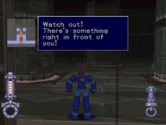 A jogabilidade, francamente, agradará apenas a um público seleto, para não falar que espanta todos os fanáticos tradicionalistas de Mega Man, uma vez que é a primeira incursão do personagem da Capcom por um mundo tridimensional. São duas as configurações disponíveis. Na primeira a movimentação é feita com o direcional digital e a câmera é rotacionada com R1 e L1. Na segunda, Mega Man só vai para frente, para trás e gira com o d-pad, mas precisa de R1 e L1 para dar passadas laterais, a essência dos controles no que se refere à “interface de combate”. Eu pessoalmente indico o segundo layout. Com ele, vai parecer que você está num third-person shooter do bom e velho Super NES. Ou, para quem quiser pular uma geração dos games na referência, se aproxima dum Resident Evil em que a câmera não fosse tão fixa e com predileção por ângulos insólitos, já que permanece fielmente atrás de Mega Man, exceto quando o jogador pressiona R2 a fim de manusear o canhão no modo target (a mira estacionária do herói). Aqui vai, não obstante, uma crítica, e com Ape Escape em mente: toda essa confusão de botões de gatilho e direcional digital, que unidos, na teoria, dão em 8 teclas, seria resolvida e simplificada se empregassem o analógico esquerdo para movimentação do protagonista e o direito para rotação da mira e operações mais stealth.