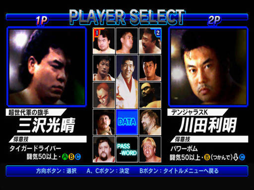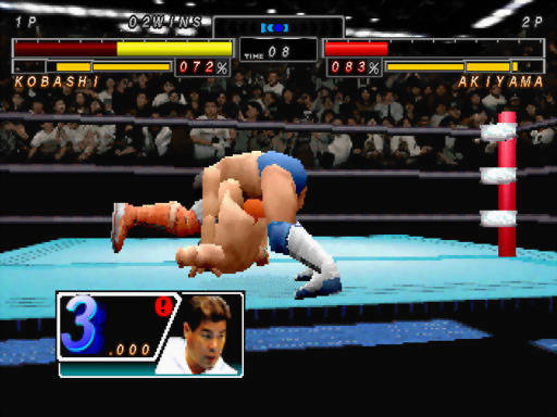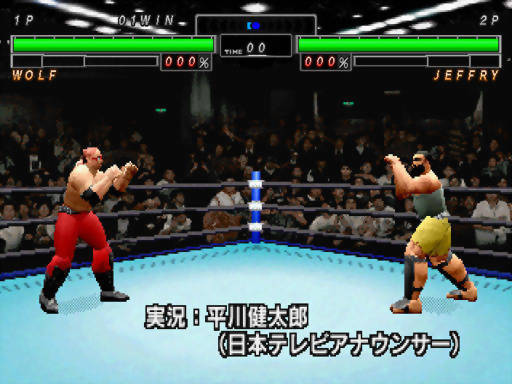 Eu ODEIO “luta livre”, wrestling, UFC, aquelas encenações americanas cheias de siglas com W (que acho que chamam atualmente só de WWE e são soap-operas nos States para macho adulto que mora com a mãe – ou, dizem, mas não acredito!, entretenimento familiar, que pais e filhos vêem juntos no sofá da sala!!), e odeio sobretudo games baseados nessas coisas por conta da jogabilidade truncada e da intensa monotonia. Odeio tudo isso… NO GERAL. Então por que raios decidi jogar um wrestler esquecido de Saturn, lançado só no Japão, e até cheguei ao ponto de resenhá-lo? Sendo curto e grosso, por alguns fatores importantes, que acabei constatando por puro acaso: 1- A gameplay NÃO é zoada! 2- É um game essencialmente da Sega, usando a engine de Virtua Fighter, embora eu não faça idéia se a Scarab era um estúdio subsidiário da empresa; 3- O multiplayer é divertido, aliás o grande ponto forte da obra; 4- Por ser um licenciamento nipônico, não tem idiotices gringas, como aquelas entradas excessivamente teatrais e até “namoradas” dos atores entrando na briga, que termina virando um pandemônio com mais participantes que Smash Bros., com um maluco usando rolo de macarrão pra espancar o outro e gente atirando TVs de tubo (de isopor) na cabeça dos adversários, e outras safadezas e mesquinharias de botar inveja nos roteiristas mais rocambolescos da Televisa! (Tem até personagem gringo, sim, nesse jogo, mas isso fica para outro parágrafo…) Os movimentos e golpes são levadas a sério, encaixando bem com o joystick do console e fluindo numa boa graças ao bom uso do hardware (os desenvolvedores não tentaram fazer milagre na parte gráfica). Vamos, então, à resenha per se, i.e., à sistematização de todos estes argumentos, em minúcias! Se você achar que estou dando uma aula muito comprida de wrestler, puxe uma cadeira e fique à vontade, já que para entender o jogo será preciso absorver, a fórceps, alguns conceitos!