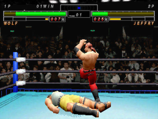 Esse game é o único da série no Saturn. Ele tem 2 seqüências, bem-avaliadas, no Dreamcast, com a adição do prefixo Giant Gram. A razão de ser do projeto e do licenciamento é o torneio real All-Japan Pro Wrestling, o campeonato nacional japonês de luta livre esportiva (para resumir, uma derivação do estilo greco-romano praticado nas refregas da Antiguidade), ou simplesmente Zen Nihon Puroresu. A parte “feat. Virtua”, que foi o que me atraiu em primeiro lugar, não é propaganda enganosa: além da engine de Virtua Fighter 1, incluíram 2 lutadores deste mesmo jogo no cast de lutadores, Wolf e Jeffry, além de um ou outro wrestler americano, i.e., não tem só japa na parada.