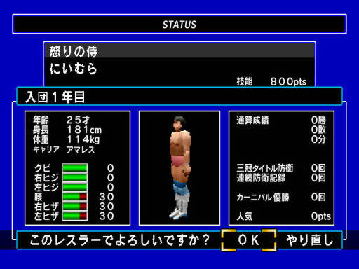 O modo mais longevo tirando o multiplayer é o career, em que você tem de criar seu próprio personagem do zero. Mais uma cool feature relativamente rara para o ano de 97. Avançando nas lutas você ganha dinheiro para comprar golpes especiais e até roupas e novos wrestlers, personagens secretos do menu (abaixo) como Sabu e Rob Van Dam (os dois americanos, convidados especiais do show). Dê uma pesquisada: esse tal Sabu deve ser-lhe um rosto reconhecível e estar implantado em nosso inconsciente publicitário coletivo, porque eu que nunca assisti o esporte me lembro bem dele de algum lugar!! Ao que consta, Sabu (nome artístico) lutava de verdade, nos campeonatos japoneses, quando no auge da forma, antes de voltar para os States e ganhar muita grana como ator nas performances circenses da hoje extinta WCW. Os dois gringos que mencionei já são cinqüentões, mas no jogo são garotões – o tempo não perdoa nem a Sega nem os wrestlers!