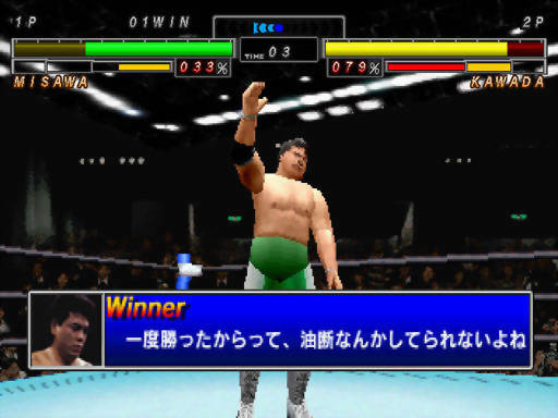 Quanto à qualidade da jogabilidade, para não dizer que esta é uma agulha isolada dum palheiro imenso, ou seja, o único wrestling simulator que presta, o feeling lembra muito a franquia Fire ProWrestling, que eu recomendei no cabeçalho da matéria para os interessados. Um pouco sobre FPW, antes que nos aprofundemos em AJPW. A série Fire coincidentemente é da Human, desenvolvedora de um proto-survival horror que resenhei no passado e upei para o rafazardly há poucos dias (Clock Tower). Pelos elogios que o título de Sega Saturn recebe, para ser sincero, só não testei o concorrente de AJPW, primeiro, porque a interface totalmente cartunizada não me caiu bem (o que pode ser um preconceito bobo); segundo, porque Fire Pro é mais antigo; e, por fim, porque eu queria experimentar essa inusitada mescla da gameplay dum wrestler com VF! Mas qualquer dia desses acredito que FPWS:6MS terá sua própria matéria no rafazardly! É uma pena que só o lixo do lixo acabe vindo para a América, e a Human também nunca tenha se interessado em exportar sua série para novos consumidores… Outro detalhe é que a série Fire ProWrestling, que parece ter começado no Super Famicom, se mantém ativa até os videogames atuais!