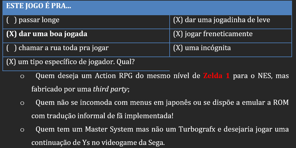 Ys III ainda seria convertido pouco mais de um ano depois para o mesmo NES, recebendo concorrência desleal do irmão SUPER Famicom; mas, se quer um conselho, saiba que o segundo capítulo é o melhor da trilogia neste sistema.