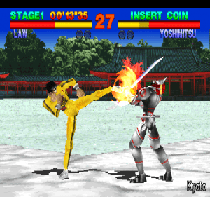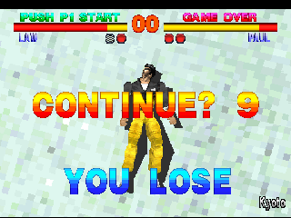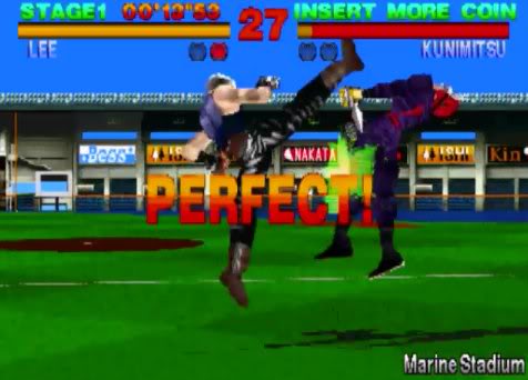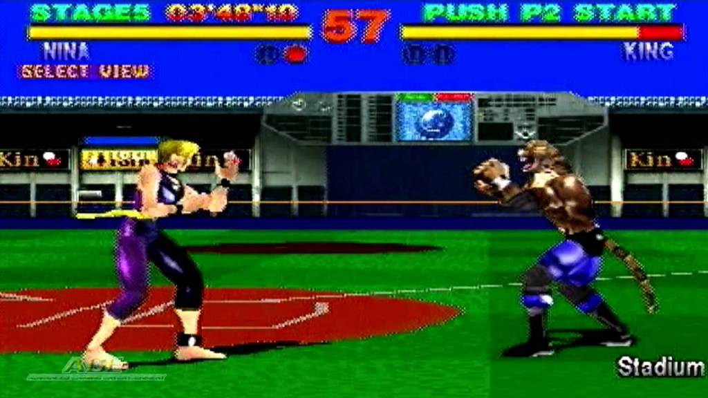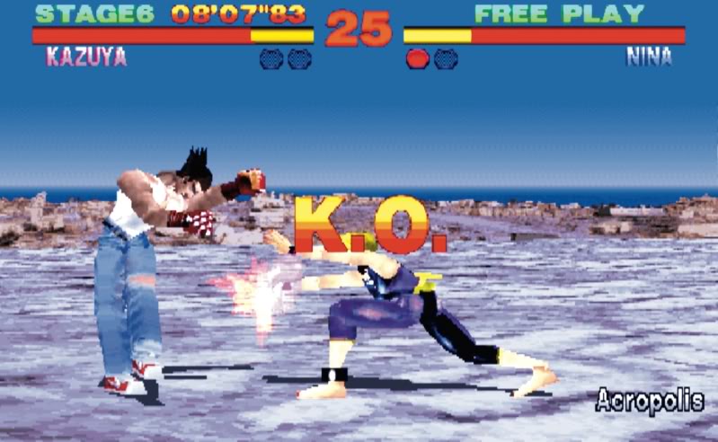 Retomando o fio da meada dos movimentos, o cardápio de golpes é assombrosamente realista para o período em questão. Os lutadores sequer disparam magias como os hadouken, limitando-se a golpes vistos no mundo real. Kuma, que é um urso bípede – e olha que eu estava falando sobre REALISMO – tem um especial que consiste num agarrão impiedoso no adversário: ouve-se até o barulho da fratura dos ossos! Mas a despeito das aparências tanto realismo não chega a atrapalhar: as poucas teclas do PSOne dão conta do recado. Cada lutador tem mais ou menos um estilo exclusivo, com forças e fraquezas particulares. Ilustrando, Law usa o Jeet Kune Do. Seus socos e chutes são ágeis e letais, porém os veteranos podem explorar os ataques cegos dos novatos em busca de hits baratos por meio de contra-ataques igualmente destrutivos (ele é um cara que deixa a guarda excepcionalmente aberta). King é um daqueles caras do “mucha lucha”, meio circenses. Seus golpes são extremamente lerdos, mas sua vantagem está nos agarrões. E como agarrões são encaixados principalmente em contra-golpes ou blocks, o ideal é usá-lo defensivamente. Lutadores como Paul, Law, Kazuya e Nina são simples de controlar já no primeiro dia de convivência com o jogo. Os mais experimentados descobrirão o prazer de se arriscar em praias mais inóspitas, ou seja, controlando os subestimados do jogo, os grandalhões vagarosos tais quais Kuma e Jack.