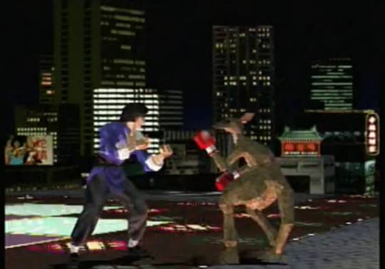 Então o Heihaichi filho destronou o Heihaichi pai e passou, ele mesmo, a ser o tirano e boss final do game? Quanta ironia! Nada melhor do que essa “guinada estática” do enredo para exemplificar Tekken 2, “igual mas diferente” de T1. Todos os lutadores do game passado da Namco estão de volta, mais 9 inéditos. Só metade começa jogável, como de hábito. Fãs de segunda viagem apreciarão o retorno de Paul e Yoshimitsu de braços abertos, sem esquecer de dar as boas-vindas a sólidos estreantes como Jun Kazama, Baek, Jack versão 2.0 (lembra-se que ele era um robô?), Lei (o “Jackie Chan tekkeniano”), entre outros. Mas algumas inclusões são reconhecidamente estúpidas, como um canguru e um dinossauro que lutam boxe (?!), um anjo e um demônio, um ursão da montanha e outras dessas táticas dialéticas sujas para aumentar o número de personagens sem no entanto criar novos golpes ou mesmo utilizar tantos polígonos e quadros de animação a mais. Com o tempo acostuma-se com as estranhezas e bizarrices…