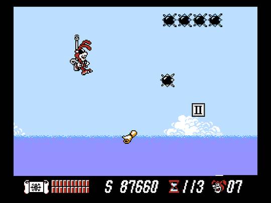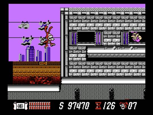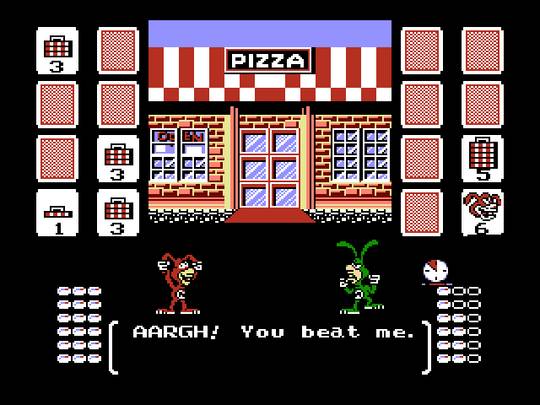 As fases em side-scrolling a pé são intercaladas por zonas em que se utilizam veículos especiais. O skate e o pula-pula são aceitáveis, mas o helicóptero (bobocóptero, eu diria, pois é apenas uma haste com hélice pregada nas costas do sujeito) é demente, de tanto que complica as coisas… Além disso, os confrontos com os chefes não são no gênero ação, mas acontecem às portas duma pizzaria (acharam que não iam colocar o produto principal da Domino’s no meio de tudo, sob algum pretexto?), num pacífico Concurso de Quem Come Mais. Cada um tem seu turno e a forma de decidir quem é o mais comilão e resistente dos dois (Haja estômago de borracha para agüentar a mais dura das massas! Será que são pizzas de cenoura para agradar os competidores coelhos?) é através de cartas numeradas, fora uma ou outra com funções especiais, a ser explicadas mais adiante.