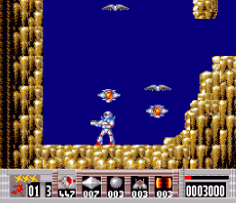 Além das dificuldades narradas acima, Turrican pode ser de árdua finalização até mesmo para veteranos pelo fato de não haver animações quando seu personagem sofre dano, isto é, ele não brilha, pisca ou nada do tipo. É bem capaz de passar batida a informação de que o life meter está se esvaziando, se o jogador não prestar atenção no canto da tela. Não há aquele famoso lapso de recuperação para seu personagem, o que significa que em poucos segundos um mesmo inimigo pode aniquilá-lo, se você não se mover para longe do raio de ataque (aqui o parentesco é decididamente com os Mega Man mais apelões da “antiguidade”, com a diferença de que num Mega Man de NES tem-se 8 chefões e depois Wily, enquanto em Turrican são 12 deles!). O lado bom é que ao morrer ressuscita-se no mesmo lugar (se tiver vidas o suficiente, ou seja, mais de 1). Na prática, significa que seu medidor de vida é pelo menos 3 vezes maior no começo do jogo (havendo ainda muitas vidas extras pelo cenário) – só o game over é que força o jogador a recomeçar da largada da fase. Por fim, só faltou mesmo um último chefe mais imponente para tornar a dificuldade digna de um pesadelo armagedônico para os hardcore side-scrolling shooter fans!
