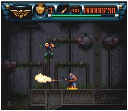 Por falar nos chefes, há alguns, mas nada que justifique per se experimentar o jogo para quem não é familiarizado com este universo ficcional: são batalhas geralmente insossas. Mas a barata… ah, a barata – ela vai fazer com que toda sua poupança de vidas e munição durante a aventura inteira se dissipem em vão numa única tela! O normal é que o non-hardcore platform gamer não vá querer se aprofundar tanto depois da luta com Rico (o irmão gêmeo de Dredd) caso sucumba 1 ou 2x e dê game over. As últimas fases, extra-longa-metragem, são sinônimo de frustração (ademais de se parecerem, graficamente falando, com o próprio inferno!). Eu ia reclamar pela terceira vez da barata gigante aqui, já que esse ponto delicado do game merece insistência, mas deixa pra lá…!