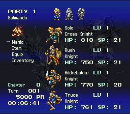 A princípio seus parties (grupos) se movimentam e agem de forma independente e autônoma pelo tabuleiro/terreno. Os inimigos possuem configuração correlata. Mas depois de um primeiro turno em que se estabelecem os preparativos para o arranca-rabo a integração entre as unidades será maior. Cada tropa poderá se mover distâncias diferentes baseada na posição atualmente ocupada e nos números de seus componentes. Ou pode, a cada turno, atacar ou escolher habilidades específicas. Desde já avisamos que o sistema privilegia combates mano-a-mano, evitando a tática (barata) dos assassínios (covardes) a distância! As supracitadas “habilidades” não incluem itens do inventário, que podem ser usados indiscriminadamente sem gastar turnos – inclusive mágicas de healing coletivas. É possível atacar de 7 a 30 vezes por turno, até que seja a vez da CPU, cada ataque selecionado manualmente. Após cada turno, pontos de experiência e itens (em caso de mortes de adversários) são distribuídos. Em suma, temos uma engine que é uma espécie de meio-termo entre Final Fantasy Tactics e Ogre Battle da Atlus.