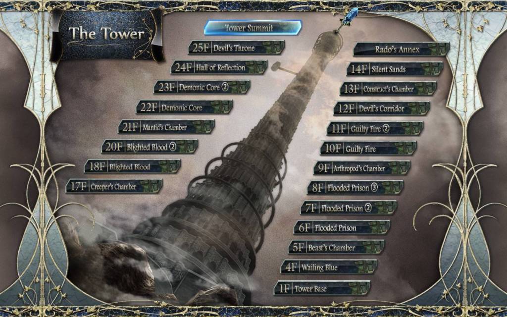 A torre tem 25 andares que podem ser divididos em 6 ambientes ou zonas em especial, temáticas (ecossistema aquático, desértico, ígneo ou vulcânico, pantanoso,…). Cada uma dessas zonas é guardada no final por uma das grandes bestas que assolaram o santuário horas antes. Há subchefes no meio do caminho em algumas das zonas (que geralmente são distintos conforme se está na jornada de Yunica ou na de Hugo), e o confronto final se dá no topo da torre, contra um sétimo inimigo misterioso. No térreo, em contrapartida, ponto de encontro pacífico entre os membros da guarda de Ys, nunca incomodado por monstros, onde, inclusive, o jogador aciona sua primeira estátua da deusa e recebe os primeiros itens, sempre será possível, após sair destroçando demônios de forma inclemente por vários andares, “dar uma pausa” na ação frenética, conversar um pouco, angariar pistas se o gamer estiver travado em algum puzzle ou ponto-chave do storytelling e, ainda, obter um upgrade específico de poder ligado a um mago especialista, Rico, NPC que permanecerá a virtual totalidade da expedição de resgate das deusas plantado no ponto inicial, cumprindo ordens (o pré-requisito para que ele o ajude é que você colete determinado item com o qual ele pode interagir e fortalecer seu método de ataque consideravelmente, como veremos). Parece “linear demais”, tirando a descrição do andar térreo, mas os plot twists da trama garantem que a excitação se mantenha em nível constante.