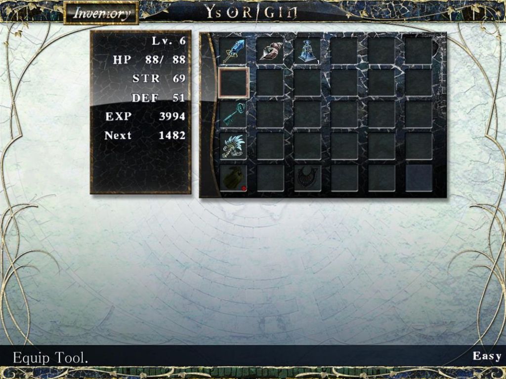 Uma das teclas tanto pausa como abre o inventário (e outros 4 menus, que ainda descreveremos). Sobre a diferença crucial entre equipamentos e itens ou posses de inventário, algo já ensaiado acima, a principal bronca de alguns jogadores com o sistema de Y0 é que, justamente, mais de um equipamento de determinada categoria não pode ser usado ao mesmo tempo e é preciso abrir a tela para praticar o revezamento. Seria mais efetivo tornar seu uso constante ou automático. Por exemplo, algumas rampas muito íngremes exigem as Earth Dragon’s Claws para serem escaladas, mas no mesmo ecossistema em que essas rampas proliferam há a ocorrência de muitos zumbis ou criaturas imortais. Após serem derrotados eles não dão itens nem pontos de experiência e revivem depois de alguns segundos, se você não estiver usando as Silver Chimes, outro equipamento com propriedades divinas, que exorciza a alma do monstro e faz com que seu corpo se desintegre para sempre. A mesma coisa para o item que aumenta o fôlego dos heróis debaixo d’água e uma espécie de “remédio” que aumenta seu atributo Força em 10 pontos fixos e pode ser achado em baús ao longo de toda a Torre do Demônio. Suponha que você ache uma dessas panacéias enquanto explora o segundo ecossistema de Ys 0. Pausa e utiliza a unidade, ganha o boost definitivo no atributo STR. Esquecido de que é necessário sempre re-equipar o artefato que ajuda a se manter muito mais tempo sem respirar enquanto mergulha, passa a uma sessão de jogo aquática e… mesmo jogando no very easy recebe um espantoso aviso na tela: você morreu! Claro, depois de usar o ampliador permanente de alguns pontos de STR, mesmo que ele tenha sido esgotado, seu ícone no menu continuou como o selecionado da vez. Seria preciso ter pausado e voltado a equipar as brânquias para nadar à vontade. Intuitivamente falando, a opção dos criadores não faz mesmo sentido.