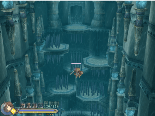 A perspectiva é de cima para baixo, mas não espere um “olho de pássaro” como em Ys1&2. Ao contrário das encarnações mais modernas das aventuras de Adol, a câmera é fixa, e dependendo da sala ou corredor se deslocará mais para trás ou laterais do personagem que para cima. Geralmente o ponto de vista é inclinado. Câmera fixa é uma excelente notícia para um game que possui elementos Plataforma 3D. Mas o plano isométrico significa que alguns trechos oferecerão dificuldade no cálculo da profundidade. Pode-se errar saltos, mas não há abismos na torre: não há morte ou dano por queda de grandes alturas. Em verdade, em pontos sem qualquer parapeito em que o personagem poderia cair de forma fatal o jogo sempre cria uma “barreira invisível”: o boneco 2D (os bonecos são 2D em ambientes tridimensionais, falarei mais disso na seção GRÁFICOS) não dá um passo além da plataforma em que está situado. Portanto, errar em pulos no máximo atrasará um pouco o jogador. Há até lugares em que cair parece ser ruim, mas quem decidir encarar a “armadilha” perceberá que encontrou uma sala com segredos ao invés. O elemento Plataforma não é muito mais rico que isso, representando uma parte minoritária da gameplay. O hack ‘n’ slash salpicado por elementos de RPG prevalece.
