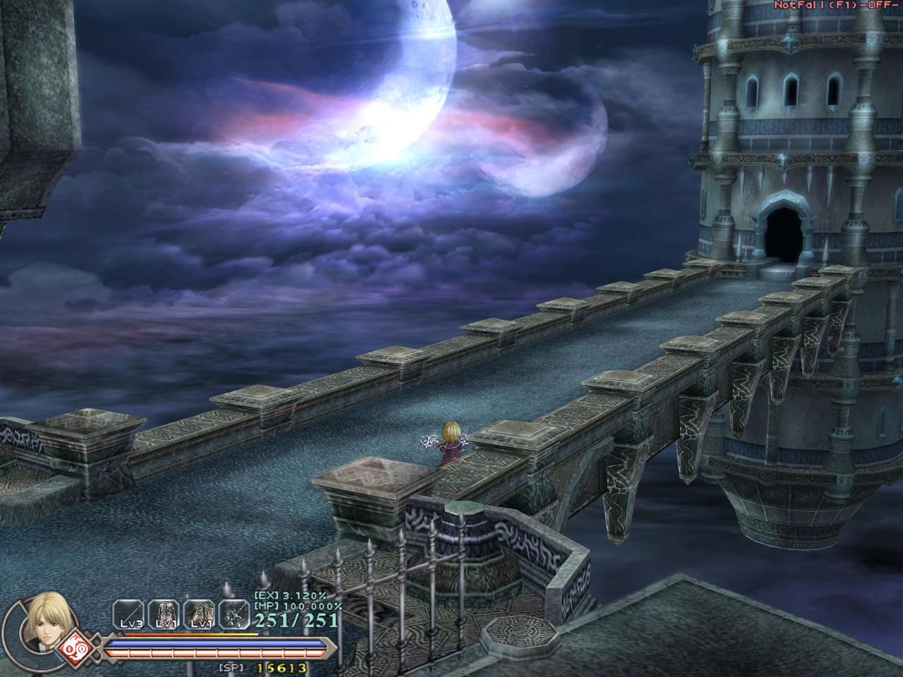 O problema é que durante a execução da engenhosa magia de transporte vertical algo dá muito errado e todos acabam se separando após um forte impacto… É aqui que você assumirá a pele de um dos membros da expedição. A única edificação facilmente visível de quase todos os pontos neste lugar selvagem é uma enorme torre cinzenta. Seja qual for sua razão de ser, raciocina-se em começar as buscas por ali. Até onde se sabe, segundo o folclore de Ys, todo o edifício fôra construído no hiato entre a elevação do país e o incidente do dia: os demônios pacientemente aprenderam a arte da engenharia civil e deram curso a uma obra em larga escala para um dia realcançarem Ys, reino tornado em ilha flutuante cheio de presas humanas, que seus estômagos adoram. E essa obra diabólica de uma raça incrivelmente persistente leva o nome, dentre os nativos de Ys, de Torre do Demônio. Significa, portanto, que você está se dirigindo a um abrigo do inimigo, como uma mosca indefesa a ser apanhada em pleno vôo por teias-de-aranha inóspitas…