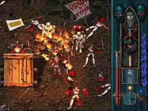 Blood Omen: Legacy of Kain funciona numa interface digna de um old-fashioned Zelda (salvo pelo fato de que você joga como um vampiro ao invés dum elfo paspalhão e que há várias cutscenes ornando a gameplay), com as mesmas múltiplas cidades e dungeons do clássico nintendista mais uma porrada de secrets no mapa, sempre visto de cima. Os puzzles são simplezinhos e você não precisará esquentar muito com eles. Se tem um switch numa sala, é quase certo que ele abrirá exatamente a porta que você precisa atravessar para chegar ao chefe, sem rodeios. Eclético esse tal vampiro Kain, já que ele incorpora ainda o mago, lançando spells, se transforma em morcego, lobisomem e uma pletora de outros shapes (sentiu o gostinho de Alucard do bagulho?) e vira e mexe, obviamente, finca seus caninos em pescoços alheios (infelizmente, a operação é menos literal do que minha ambição poética deixa transparecer – Kain normalmente “convoca” o líquido da vida para sua bocarra ostentatória sem necessitar, para isso, entrar em contato com a pele da vítima e iniciar sucção…). Os métodos de ataque não diferem de outros Adventures, inclusive no que se refere às toneladas de espadinhas que se acumularão pelo caminho. Uma vez que as vítimas estejam tontinhas da silva, naquela pose de “Finish Him!” do Mortal Kombat, é hora de dar um tapa na tecla “O” para sorver o vinho e preencher seus HPs. Pode-se chupar o sangue de praticamente qualquer coisa viva no jogo, não só humanos, e as dungeons costumam apresentar corredores repletos de prisioneiros gemendo em suas correntes, implorando liberdade (para pedir liberdade a um vampiro, imagino que estejam se referindo eufemisticamente à morte, preferindo sofrer um ataque brutal e expirar de uma vez a uma lenta e excruciante putrefação no calabouço). É como eu disse da falta de escrúpulo de Kain: não tenha pena ou compaixão, esses figurantes são apenas como os coraçõezinhos de Zelda; se Kain não aproveitar o banquete, vai ter problemas nas próximas salas da dungeon… Alimente-se com cautela, entretanto: algumas das vítimas, principalmente as bestiais, tendem a apresentar toxinas na corrente sangüínea, o que só iria te ferrar… Sem ter muito como se perder nos layouts lineares da aventura, os principais descaminhos de Blood Omen dizem respeito à detecção de colisão meio capenga e à navegação nos menus, que deixa os apressadinhos exasperados, com seus loadings de 10 segundos… Outra preocupação é que a iluminação das telas é praticamente inexistente, e é um alívio saber que o feitiço “Light” será aprendido logo no começo.