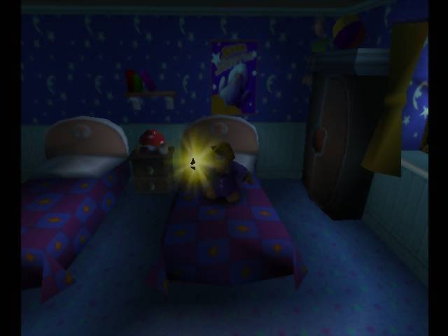 Primeiro, considerações sobre os protagonistas. A diferença é apenas visual: Tumble usa seu próprio teddy bear como arma, veste pijamas rosas. Ruff veste azul, no contraste mais previsível da história, e sua arma de preferência é uma vela sempre acesa (que sádico!). Ambos são carismáticos e fofinhos como dragões, crocodilos, jacarés e outros animais esquisitos por aí não conseguiram ser nessa era dos games que tentava emplacar mascotes a todo o tempo. Além de saber dar chutes e socos, além de bundadas no solo como era super-comum nestes anos (sobretudo para quem se inspirava em platformers lançados para o videogame concorrente, de 64 bits), os irmãos possuem até ataques remotos ou eu diria “telecinéticos” ou mágicos? Basta gritar e uma onda de choque fuzilará inimigos numa linha não muito distante. Considerando que maioria do jogo se passa em cômodos não muito amplos, acertar a mira e manter a munição de “gritos” deverá bastar para lidar à média distância mesmo com os adversários mais chatinhos. Quadrado aciona os golpes de curto alcance. Pressionados em rápida seqüência eles são soco-soco-chute, uma espécie de mini-combo para satisfazer os mais action-oriented que puserem as mãos no título. A tal da munição para os gritos são luas, ou meias-luas, cada uma permitindo uma emissão sonora agressiva, através da tecla Bola. A tecla Bola, em conjunto com outras, produzirá a maioria dos movimentos úteis em RT. Slides ou rolamentos são feitos com Bola, de novo, mas em movimento (enquanto segurando o direcional), e são uma maneira bastante eficaz de infligir dano, pois os socos não atingem inimigos a 1m de distância, dado que estamos falando de criancinhas com bracinhos do tamanho do gravetos. O butt-stomp é um movimento engatilhado por pulo (X) + Bola ainda no ar ou simplesmente por X+Bola ainda no solo, pois a engine lerá o movimento do mesmo jeito, e o primeiro gesto precederá o segundo rapidamente na tela. Triângulo aciona a visão em primeira pessoa (o gamer precisa manter a tecla pressionada). L1 e R1 giram a câmera para lados diferentes. Seu medidor de vida é o mais esquisito de tudo quanto já dissemos: letras “Z”, o famoso ícone ou onomatopéia mais associada ao sono profundo. Começa-se com 50, podendo-se acumular até 99. O importante é não chegar a zero e acordar (no game, morrer). Cada porrada levada ou interação infeliz com armadilhas no ambiente retira de 1 a 3 ou 4 Zs do jogador, que ele pode voltar a recolher, a depender da situação, numa interface muito mais amigável que a de Sonic The Hedgehog, que, para começo de conversa, faria metade dos anéis possuídos voar para fora do alcance mesmo da criatura azul mais rápida do leste e do oeste!