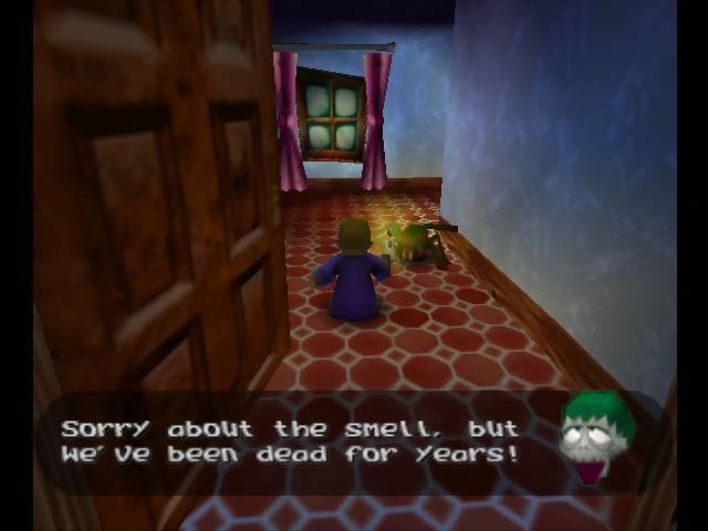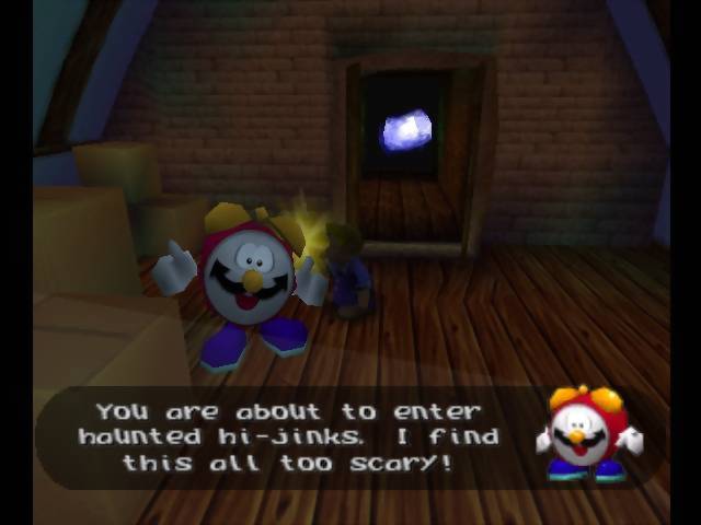 Os 6 mundos são os “protagonistas” atmosféricos do jogo, pois cada um vibra com personalidade própria e dinamiza muito o conceito já um pouco batido (para nós, nem dizer; mas já em 1999!). Na casa assombrada, por exemplo, todas as paredes estão cheias de retratos de potenciais ex-moradores do local, tipos à Addams Family (apenas paródias, por questões de direitos autorais, imagino). A cada curva de corredor você escuta os distantes lamentos de alguma alma penada e o arrastar de móveis antigos como efeitos sonoros perfeitamente complementares à faixa sonora. Não faltam, por sinal, os móveis visíveis que sofrem do chamado efeito Poltergeist, num recinto em que você deve utilizar um deles para alcançar uma plataforma mais elevada. Um candelabro voa pela biblioteca e no início o jogador se intimida pensando ser um adversário, mas ele apenas “indica o caminho” numa bifurcação, para quem presta atenção. Nada que vá assustar adultos ou mesmo crianças – mas algo relativamente parecido com o mundo 5 de Super Mario 64, com menos atmosfera e “vales da estranheza” e muito mais cores. Tem até um piano, que não se mexe, diferente do “piano bocudo” de SM64, mas que pode ser TOCADO quando seu personagem pula sobre as teclas (novamente a referência aqui SÓ PODE ser BK no mundo da casa fantasma gigante). Tudo isso se encontra apenas na primeira sub-área do primeiro mundo, mas pararemos a descrição mais minuciosa por aqui, pois já deu para passar uma idéia da riqueza de detalhes com que o usuário se deparará…