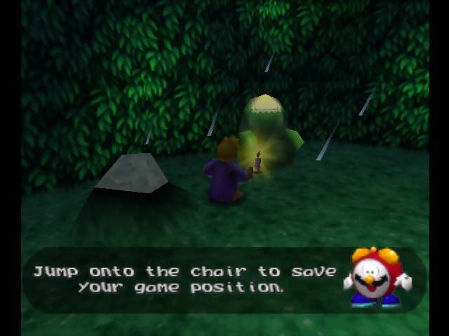 Se há críticas a fazer, eu diria que as lutas contra chefões poderiam ter sido retiradas (penso a mesma coisa de Donkey Kong 64, cujos confrontos são um pouco épicos demais para o meu gosto!). Lembra do assistente de Nitekap, o palerma e quase sem iniciativa Threadbear? Ele sempre o desafiará usando um gadget ou dispositivo diferente, exigindo novas estratégias. O bom das batalhas com o maior inimigo de cada mundo, pelo menos, é que Wakey-Wakey, constatando que você está em maus lençóis, intervirá com dicas sobre o ponto fraco da criatura. Mas a contraparte mais divertida às insípidas boss battles são os minigames de corrida obrigatórios em cada mundo (serão 6 duelos sobre rodas, ou às vezes outros veículos inusitados, cada vez contra um adversário – o primeiro, para se ter idéia, é uma bruxa em sua vassoura). Seja como for, após cada grande vitória (completar tudo que se tem para completar num dos mundos), é acionada uma nova FMV (nada disso no N64, apenas common graphics, hehe!) exibindo o hilário temperamento de Nitekap, incapaz de enxergar suas próprias falhas e sempre culpando seu mascote pelo êxito das crianças. Será que devo mencionar que, idem ibidem BK, os desenvolvedores se preocuparam até em mostrar uma cena animada de game over mostrando o unhappy ending (do vilão conseguindo roubar o sono dos inocentes para si)?