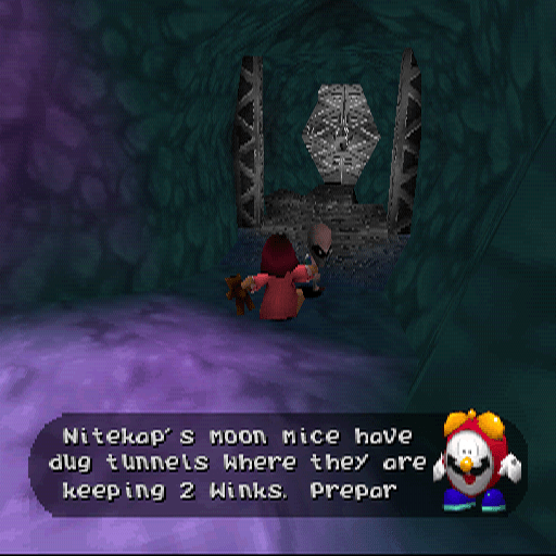 40 Winks (doravante 4W, ou RT, como às vezes é conhecido no continente europeu) não tem público-alvo, e é aqui que divirjo em relação a todos os outros resenhistas que encontrei. O enredo é Disney, sem dúvida, mas a proposta mistura terror atmosférico inofensivo (sem sangue aqui!) com collectibles (como era moda nos 90) com uma certa dificuldade intencional. Devo comparar 4W o tempo todo com outros jogos seus contemporâneos entre parênteses ao longo da matéria, todavia chamarei a atenção para um jogo muito pior e muito mais vendido no PS1, logo de entrada: Harry Potter and the Sorcerer’s Stone. Pense em 4W como o HPSS bem-feito. Um diferencial deste game é que são dois os protagonistas, e eles NÃO formam uma unidade, tal qual em Banjo-Kazooie/Banjo-Tooie: são os irmãos de uns 5 ou 6 anos (talvez 4?) Ruff (o menino) e Tumble (a garotinha). Escolher um dos dois não alterará a gameplay a não ser em pontos tão específicos que sequer merecem citação, e francamente não acrescenta tempo de jogo – é apenas uma customização a mais. O título americano já resume a premissa do storytelling: criaturas chamadas winks, os guardiães dos sonhos das crianças, quatro dezenas deles para ser mais preciso, foram aprisionados pelo vilão do jogo, e será necessário, no meio de seus sonhos-pesadelos, restabelecer a normalidade no mundo onírico. Alguma semelhança com libertar os Jinjos da opressão da bruxa verde Gruntilda (Banjo-Kazooie, doravante BK)? Nitekap, o dito vilão, é só um velho rabugento e engraçado, uma espécie de Scrooges ou Eustáquio (Coragem o Cão Covarde) readaptado de Charles Dickens para não parecer odiento – seu único problema é que ele é insone. Então, formalmente, ele parece mais conosco do que as criancinhas – podemos ser simpáticos com suas ações! O idoso com grandes olheiras tem um curioso ursão de pelúcia – um urso de pelúcia gigante e animado, Threadbear, porém um tanto falto de inteligência e submisso demais ao seu dono, apesar da voz grossa – subordinado que deverá ser seu braço direito na “cruzada” contra duas criancinhas… Dará certo?! Duas FMVs (versão PSX/PC) introduzem o enredo do ponto de vista da mãe das crianças e do último chefão. Duas belas e enternecedoras animações, dignas do melhor que a indústria podia produzir à época (Shrek, etc.). Ao longo do review contaremos as diferenças entre a versão mais popular (PlayStation) e a curiosa existência de 4W no Nintendo 64, como, por enquanto, seu último jogo oficial, lançado estonteantes 20 anos depois do plano original!