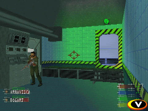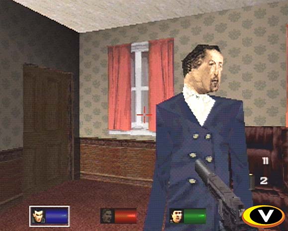 O único benefício da versão PS (e isso comparado só com a versão N64) são os full motion videos que ajudam a contar o enredo, pois os gráficos dos trechos jogáveis são bem feios. Casas, selvas e plataformas petrolíferas horríveis aguardam o jogador. Não é exagero falar em “bancarrota estética” nesse departamento! Ótimos toques na parte gráfica que até o PlayStation1 podia levar a cabo, como o efeito de embaço (blurring) – perfeito em Metal Gear Solid –, não foram implementados com sucesso, e as partes embaçadas são muito mais falhas de programação do que algum embelezamento deliberado, até porque se nota que o efeito está fora de contexto. Parece que a utilização dessa engine só satisfez no módulo de visão noturna. Provavelmente você não será capaz de jogar a primeira fase mais de duas vezes sem se cansar da textura das paredes. Acrescentamos mais: os reféns são tão feios que você terá vontade de atirar neles ao invés de resgatá-los (veja a imagem abaixo!) – mas isso o forçaria a fazer tudo de novo, e voltar atrás nas missões esgota a paciência quando o jogo não é bom… Importante notar, também, que todas as versões jogadas em uma TV (a despeito do Dreamcast emular com perfeição os polígonos do jogo para PC) apresentam uma limitação adicional, que é a maior dificuldade de entender a fonte das palavras que aparecem na tela com indicações, já que a resolução de um aparelho de TV antigo é bem mais baixa que a de um monitor.
