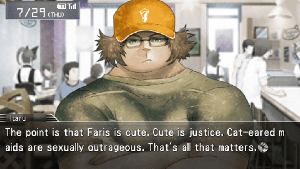 Uma visual novel, diferente de outros jogos, só pode ser tão boa quanto sua própria narrativa. E o writing em Steins;Gate, temos de admitir, é excepcional, no micro e no macro. De volta ao protagonista: A despeito de (ou talvez devido a) seus maneirismos esquizo, ele é o herói perfeito para esse tipo de backstory. Talvez porque seu character design seja horrível em comparação com os demais e porque ele seja tão apagado… afinal ele não deve roubar a cena… Ele deve ser você! Um dos motivos para garantir que uma adaptação para anime faria a visual novel perder uma de suas melhores qualidades… O que na minha opinião acabou acontecendo… Sobre o que se depreende de Okabe conforme os fatos sucedem, ele é na verdade muito mais gentil, empático e preocupado com os amigos do que sua fachada bidimensional deixava entrever a princípio. Kurisu, inteligente também nas relações interpessoais, quiçá tenha aceitado se aproximar do “maluco” porque já desvendara isso mais rápido que qualquer jogador estreante. A perversão desta VN ficará confinada a situações episódicas e personagens que possuem péssima fama na comunidade “steins;gateira”, como Daru ou certos aspectos problemáticos da dona dum maid café de Akihabara (isso mesmo, café de empregadinhas…), Faris. Ainda assim, Faris – continue lendo – é um excelente personagem, tudo considerado. Quanto a Okabe, ele só é tímido demais para se mostrar em sua complexidade e prefere recorrer a tropos que o infantilizem diante dos demais; talvez mesmo antes de desencadear os problemas que são o motivo da visual novel já fosse um rapaz… tão lúcido quanto… deprimido; e isso é quase tudo que posso revelar numa resenha sem spoilers!