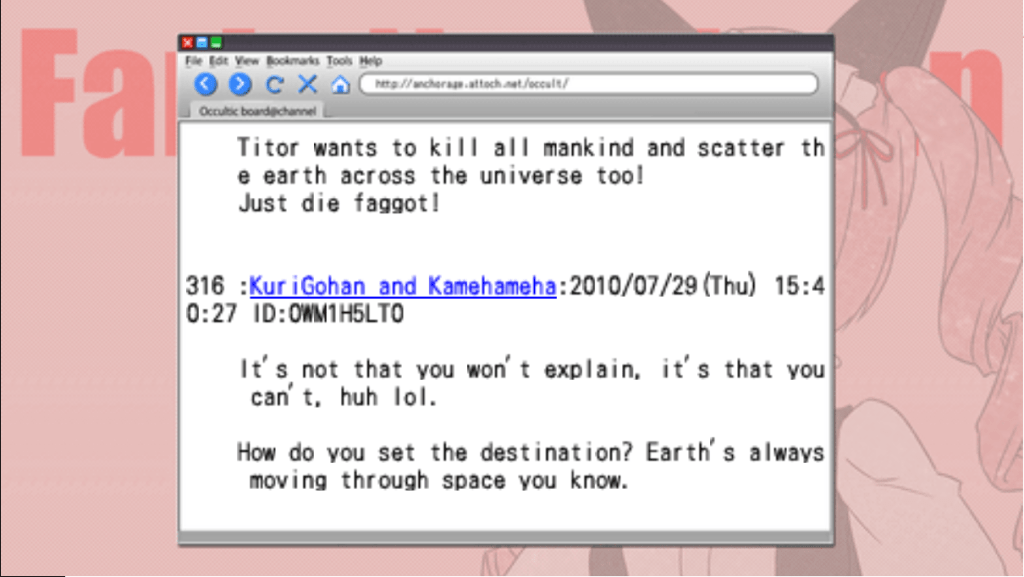 O jogo até exagera o lado negro da estória: nele, JT freqüentou fóruns japoneses e todos o espezinharam. Por compaixão, simpatia e certo compromisso de “jogar cavalheirescamente um jogo [em que se finge que se acredita no interlocutor, afinal de contas a coisa toda é muito engraçada e engenhosa]”, nosso John Titor real foi muito bem-tratado nos fóruns ocidentais à época, é o que vim a saber. [na resenha com spoilers apresentarei um log de bate-papo público desta aparição!] De todo modo, falta cada vez menos tempo para comprovarmos que John Titor não passou de um plantador de boatos muito inteligente (12 anos, e contando!)…