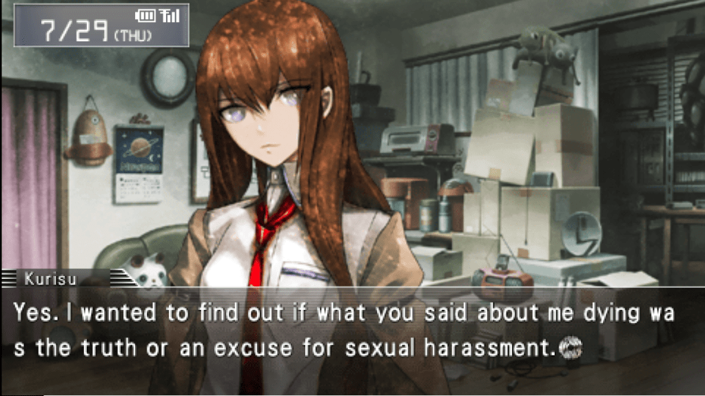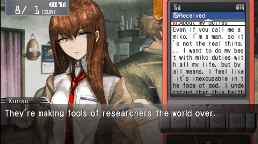 Em suma, parece que as desilusões do alter ego de Okabe, só um traço carnavalesco no começo da saga, se realizaram da pior forma possível: uma organização do mundo real quer mesmo interferir nos experimentos para conservar o monopólio sobre achados que envolvem a descoberta de viagens no tempo. Parece que o enredo despretensioso adquiriu aquele caráter gamístico de conspiração global, propício para uma “boa ação”, embora não estejamos num game de ação… Não se engane de todo – você ainda viverá seus dias como um “pobre coitado”, por assim dizer, e não terá de invadir nenhum castelo do demônio para salvar a rainha da Inglaterra, ou qualquer damsel in distress (donzela em apuros), nem fará nada ninja como combater essa corporação fisicamente, como se fosse, digamos, um Homem de Preto ou qualquer superagente. As coisas são um pouco mais sutis que isso, e é por isso que aprecio a sobriedade do roteiro. Se é que é possível, tudo sobre a tal organização e a explicação técnica das viagens no tempo faz sentido o bastante, e as informações vão sendo repassadas ao jogador de forma didática, à medida que os próprios personagens do enredo aprendem os mesmos fatos, e alguns deles mal estando mentalmente equipados para entender que diabos é viagem no tempo ou espionagem industrial!
