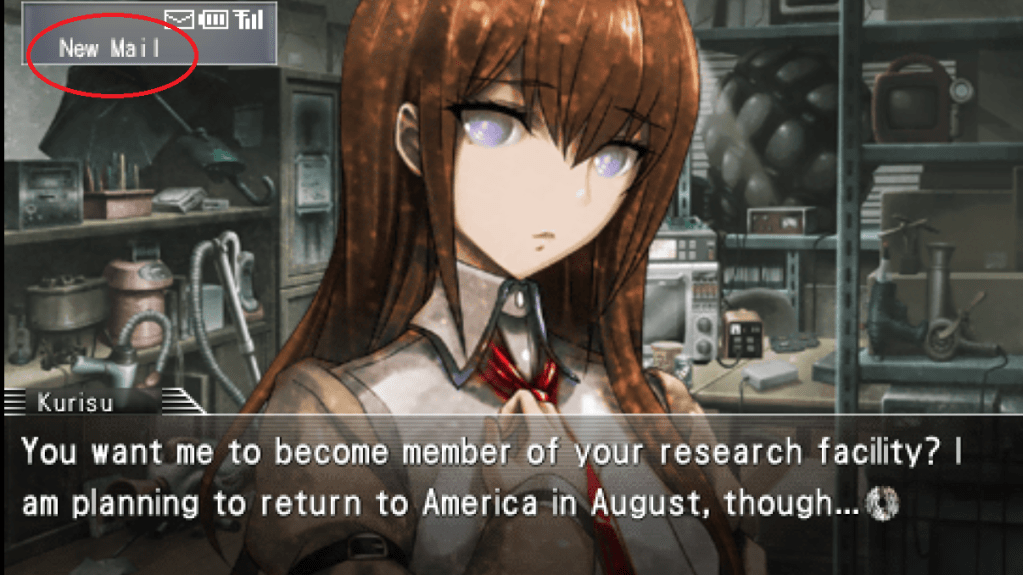 Há ocasiões específicas em que as mensagens vêm com anexo de imagem. Algumas delas são indesejadas e sinceramente perturbadoras (ponto da trama em que Okabe começa a receber ameaças anônimas e sua paranóia com a Organização -SERN- atinge o cume!). Devido aos loops temporais executados pelo personagem, não será raro que mensagens sejam apagadas do monitor de seu aparelho e, por outra parte, mensagens retroativas apareçam.