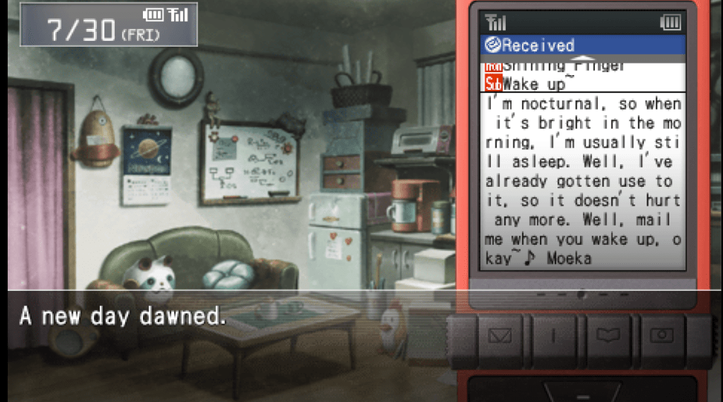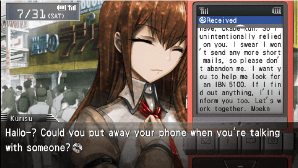 Para uma VN, Steins;Gate ainda consegue ser inovadora. Considerando que inovar nesse âmbito é proporcionar pouco mais do que uma interface em que você puramente avança o texto com uma tecla 95% do tempo, não espere nada revolucionário, mas sim de bom gosto e compatível com a própria proposta central do roteiro. Lembra quando eu disse que Houin Kyouma é basicamente o lado farsante de Okabe Rintaro, senão viciado em ou ao menos dependente de seu celular em momentos-chave nos quais precisa dar vazão a monólogos não-socialmente aceitáveis? Steins;Gate utiliza desse artefato (o celular, ainda não um smartphone, pois é 2010) como meio de obter as branching paths ou destinos alternativos possíveis numa VN-padrão, no lugar de escolhas binárias em caixas de texto. Uma tecla é dedicada a sacar o telefone do bolso, cobrindo cerca de 1/3 da tela na parte oriental. Ele executa algumas ações básicas. Quando alguém liga, o jogador tem a opção de atender ou continuar seus diálogos no mundo real e ignorar a chamada (outra faceta realista de S;G!).