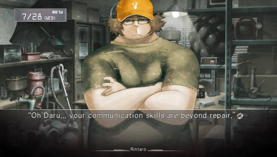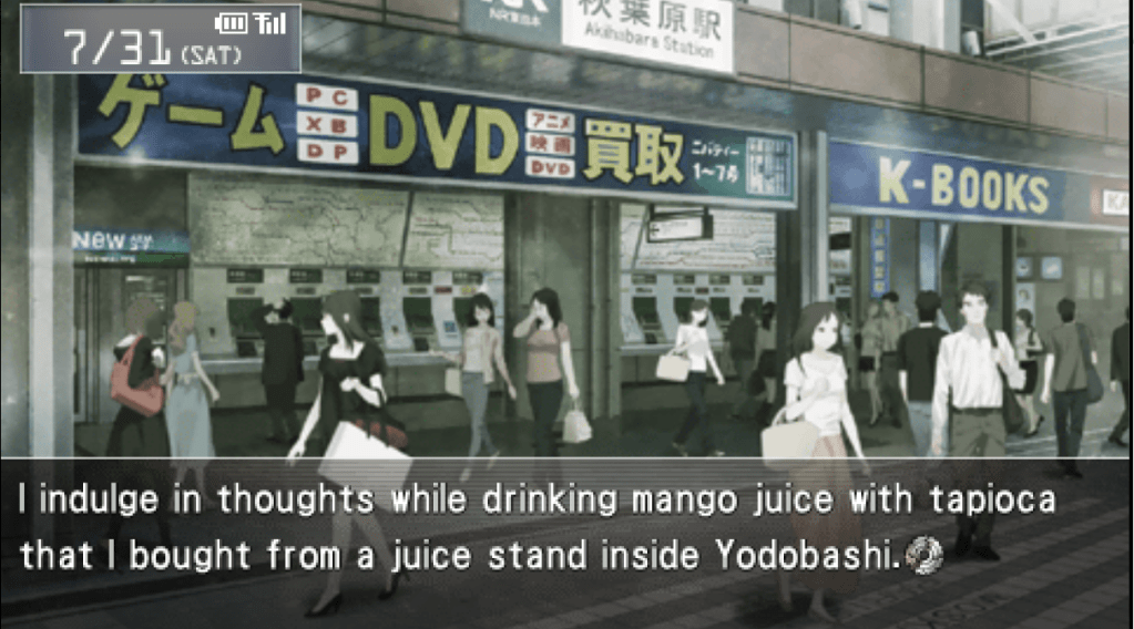 E o título, que por si mesmo não quer dizer muita coisa, remete a viagens no tempo. Viagens no tempo feitas por um universitário japonês relativamente normal, de maneiras um tanto ortodoxas para um protagonista de ficção científica… Finalmente enredos sobre viagem no tempo não são tão afetadamente épicos… Você passará a maior parte do tempo interagindo com outros jovens de seu círculo íntimo e fazendo o que otakus fazem em Tóquio – onde o jogo se passa, em 2010. As viagens no tempo, surpreendentemente, não recuam além do próprio ano, mas têm imensas repercussões – alegadamente, certa operação executada pelo protagonista modifica inexoravelmente a vida de uma mãe de um conhecido seu na década de 90, por exemplo… E, para fechar o pacote, temos uma espécie de paródia de Exterminador do Futuro sob a forma de uma das personagens secundárias, uma verdadeira viajante no tempo (digamos, para antecipar, que Okabe, você, só pode viajar no tempo mentalmente…). Por enquanto a premissa é uma bagunça, admito. Sente, abra uma água com gás, relaxe e vamos organizar as coisas e atar melhor as pontas soltas!