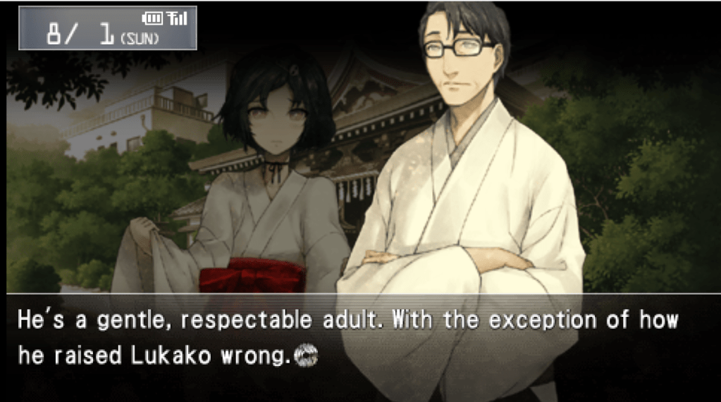 A já-comentada Suzuha é uma superatleta misteriosa, tão empolgada quanto Mayuri em seus melhores momentos, dotada de um maior senso pragmático, no entanto. E ela entra na vida do protagonista ao aceitar um trabalho de meia-jornada no tal CRT shop embaixo do laboratório… Uma bicicleta que ela sempre usa de meio de transporte parece ser-lhe um souvenir inseparável. Através de Suzuha poderíamos facilmente investigar outras personalidades, como o ambíguo dono da loja de TVs de tubo, Mr. Braun (a seguir veremos por que isso é uma piada), e sua filha pequena, Nae. Tem ainda o pai de Luka, que administra um templo religioso. Aqui quase esgotamos a lista dos que possuem um bom volume de falas e aparições, mas o jogo é surpreendentemente longo e auto-suficiente. Quando desentendimentos entre os membros adquiridos do laboratório parecem realçar acima do normal na trama (ex: Kurisu e Suzuha não se dão bem por qualquer motivo misterioso ao jogador…), Mayuri serve mais e mais como a cola que mantém individualidades tão distintas reunidas em torno do laboratório, sem que a convivência descambe para a toxicidade. E é justamente por isso que o que Okabe fez para alterar o passado pesará como uma bigorna de 10 toneladas sobre suas costas quando todos os efeitos malignos de seus experimentos se mostrarem em toda sua malícia e crueza.