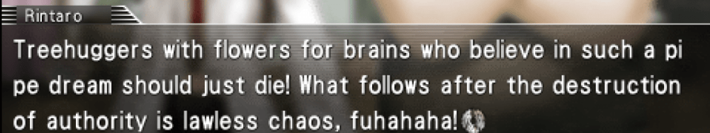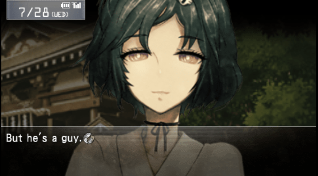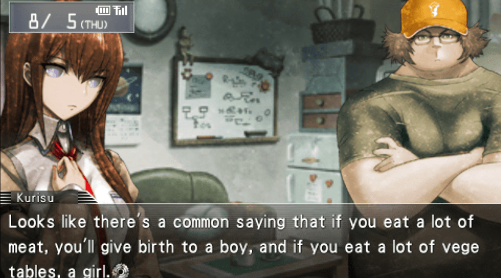 RED FLAG Tópicos controversos – ou eu diria não-controversos em absoluto! – são tratados sem tato pela equipe desenvolvedora, e eu não li essa crítica em nenhum outro lugar: apesar de muito inteligente, o roteiro não é adequado para a visão contemporânea sobre a homossexualidade e/ou o cross-dressing, por exemplo. Alguns dirão que o tema “transgênero” também se encaixa na crítica, porém NÃO é o caso em S;G.¹ Okabe acha que o pai de Luka “o criou errado” porque ele é muito tímido e “parece uma garota”, e essa opinião não é problematizada na trama. O jogo não é dos anos 80, mas da década 2000 – por isso esse conservadorismo é inaceitável!