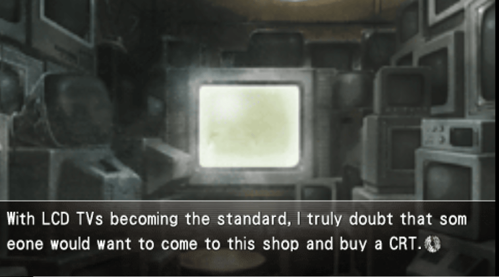 As caixas de texto quadradas na parte inferior da tela não poderiam deixar de acompanhar esse intento retrô. Repare que para a versão PC até a inicialização do jogo simula uma versão anos 90 do Windows (acima). Mayuri seduzirá perigosamente os espectadores com seu sorriso algo transcendental, onipresente na criatura, conjugado com as sobrancelhas sempre arqueadas e a íris apontando para o alto, conectada que está, desde uma experiência na infância, com os astros e o espaço sideral, como se entendesse, mas apenas em nível metafísico, o drama existencial de Okabe… O dono da loja de tubos que emitem raios catódicos para que o seu dono consiga enxergar imagens transmitidas por ondas de antenas espalhadas pela cidade (ora, falo das televisões de tubo!) é uma figura à parte: meio-francês, meio-japonês, moreno, parrudo, ‘Mr. Braun’ parece tirar prazer em amedrontar Okabe em situações ridículas e sem fundamento – e seu visual contribui para nunca sabermos quantas camadas de ironia envolvem esse NPC sensacional.