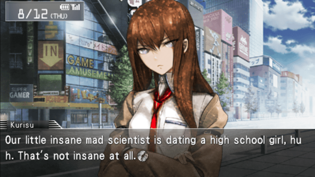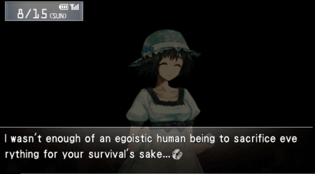 Kurisu enfim surge na escadaria mais próxima do terraço, segurando alguns papéis. Ela aguarda alguém. O doutor Nakabachi, aquele que o primeiro Okabe havia humilhado em seu seminário, aparece e revela ser o pai de Kurisu. A inteligente jovem gostaria de reparar a reputação de seu pai, mesmo que ambos tenham se tornado distantes; ele, presunçoso, pensa que a filha queria apenas roubar suas idéias. O doutor saca uma faca e parte para o ataque prolecida. Okabe intervém na hora certa. A faca cai no chão. Nakabachi pega uma chave de fenda que estava previamente no local. Kurisu desvia das primeiras investidas. Tragicamente, na luta renhida do trio, Kurisu acaba ferida pela faca de Okabe, que tentara ferir o doutor; ela se jogara na frente por instinto; seu sangue respinga no jaleco branco de Okabe ao tentar salvar a vida do próprio pai! Okabe deixa a faca cair e se dirige ao corpo desfalecente de Kurisu, enquanto Nakabachi se preocupa apenas em surrupiar a tese de Kurisu, contida nos papéis que ela carregava (que tipo de idiota não teria um back-up ou forma de identificar seu trabalho acadêmico sem margem a dúvidas?). Kurisu morre e Okabe torna-se duplamente traumatizado ao se dar conta de que o assassino da mulher que ele amava fôra ele próprio! Sorte a do protagonista que ele está numa história de viagem no tempo e de revogabilidade de mortes e circunstâncias “passadas”…