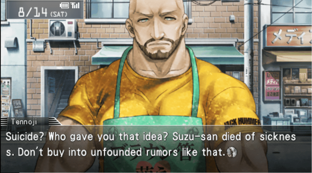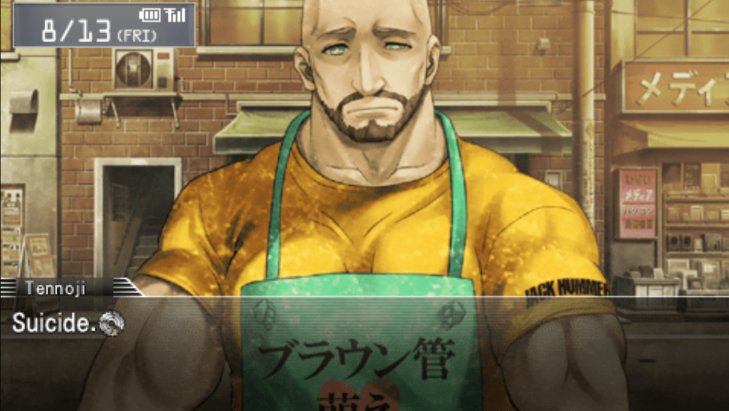 Tennouji saca uma arma, põe-se sério talvez pela primeira vez na estória. Admite seu pseudônimo “FB” e alega estar usando Moeka como mero instrumento a fim de obter o computador. Okabe se irrita profundamente pela ironia da vida de Suzuha: condenada a ir para o passado a fim de prevenir o roubo de um equipamento que, no fim, será furtado pelo homem que ela tratou com a máxima generosidade! Tennouji, longe de reagir com insensibilidade, aponta a arma para si próprio e comete suicídio. Sem tempo para enlutar-se, Okabe captura seu telefone celular, com a intenção de usá-lo mais tarde para enviar o D-Mail. Nae não estava por perto para ver a desgraça que aconteceu a seu pai.