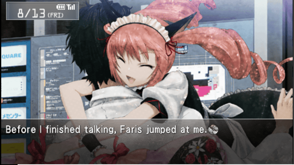 Como prometido, ela daria sua recompensa a Okabe. Exceto que ela mentiu se lembrar do conteúdo da mensagem, pois estava interessada na máquina do tempo e em se vingar dos Viral Attackers, e além disso essa já é uma outra Faris, de outra realidade alternativa. Na realidade é sumamente óbvio que a Faris desse tempo não possa se lembrar de nada, já que não foi ela em si que enviou a mensagem – falha na percepção de Okabe. Shido, que não aceitou a derrota, promove uma emboscada na porta da entrada do evento e Okabe, a fim de defender Faris, é surrado pela gangue. Num breve momento de tensão máxima, Faris parece “se comunicar” com seu outro eu e lembra o conteúdo da mensagem – seria o Reading Steiner “transmissível” via “relações de forte amizade”? O local em que o incidente termina também tem sua parte de colaboração nostálgica, uma vez que ambos tinham conseguido fugir até um restaurante de massas, que na realidade foi construído onde deveria estar o café Nyan². Uma limousine consegue resgatar ambos a tempo antes que o pior acontecesse. O pai de Faris agradece a Okabe sua dedicação e presteza em proteger sua filha.