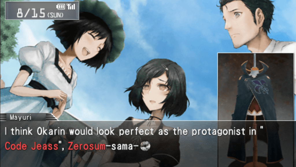 Três horas depois da “hora em que o relógio pára”, Mayuri estava viva e bem. Ninguém conseguira resolver o problemático assassinato de Kurisu Makise que acontece nessa timeline. Enquanto caminhavam na rua, num fim de tarde de verão, Mayuri desaparece. Okabe entra em desespero e grita seu nome. Mas ela só tinha ido comprar duas bebidas geladas por 15 segundinhos. Mayuri escuta uma voz feminina vinda “das estrelas”: ela diz “seja feliz”.