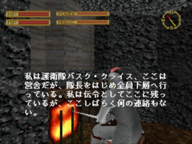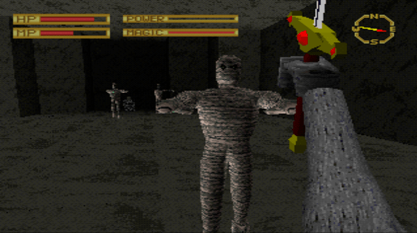 O que, então, é tão difícil de gostar em King’s Field, jogo à frente de seu tempo e sem embargo incompreendido e criticado desde que saiu, e até hoje pouco falado?! Muitas coisas. Por exemplo, seu personagem demora uns 6 segundos para dar um rodopio de 360 graus. (Embora eu tenha de dizer que já existiam teclas para strafing, isto é, passadas laterais, o que ajuda muito no mano a mano!) Ao se atingir o adversário, não há necessariamente qualquer indicação gráfica ou sonora de um hit. Se tiver muita sorte, pode ser que o inimigo em questão seja do tipo que emite interjeições de dor. E a CPU não possui barras de life, porque as criaturas em calabouços, se existissem em nosso mundo, não possuiriam barras de life e o jogo quis ser extremamente realista nesse tocante!