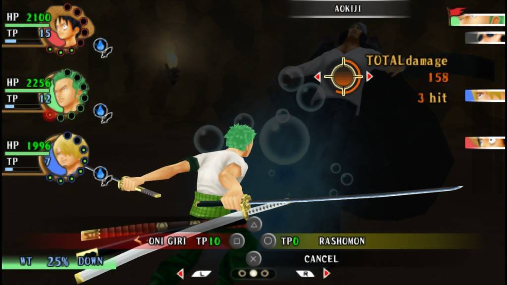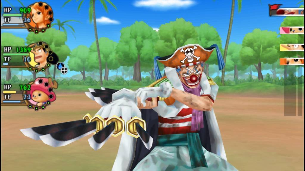 Às ações possíveis nas batalhas: defender, fugir, usar item ou atacar. Todo personagem tem seus ataques básicos que não queimam Technical Points (TPs, que são conquistados justamente desferindo ataques comuns) e os tais movimentos especiais ou técnicos, que usam os TPs acumulados. São permitidos múltiplos ataques por turno, como já deixei entrever, maioria das vezes 4, mas há sempre condições contingentes que reduzem ou ampliam esse número-base, podendo o controlador misturar os golpes comuns com técnicas especiais sempre como as últimas do combo. Vencer resulta em premiação em berrys (o dinheiro em One Piece), EXP e SP, special points, que o jogador deve usar nos menus fora dos labirintos e combates a fim de incrementar a ficha de seus personagens. O mais bacana é que os ataques especiais não são firula sem relação com a mídia de inspiração, mas as mesmas técnicas do anime, como o Gomu Gomu no Rifle ou os Three Thousand Worlds dos dois primeiros tripulantes dos Mugiwara, ou o ultra-veloz Humming Notched Arrow Strike de Brook a partir de Thriller Bark. Os membros do bando terão 5 ou mais até o fim da saga.