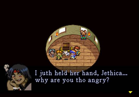 Tem uma faixa/BGM de dungeon que é horrenda. Não tanto quando escutada por inteiro, mas sua introdução é especialmente irritante. E toda vez que se entra numa dungeon e ela começa a tocar, a vontade é de dar meia-volta e sair. E a canção que embala a visita do jogador à cidade de Reza (não, não é um coro gregoriano!): como ela recomeça a cada vez que o jogador muda de tela (deixa ou entra numa casa, por exemplo), os mesmos acordes vão ser tocados ciclicamente de 10 em 10 segundos, na prática. Lyton, entretanto, consegue ser um caso mais grave que os dois primeiros juntos. Não bastasse o tema da cidade ser enlouquecedoramente ruim, ele existe em dose dupla: cantada por todos os seus habitantes sem descanso (isto é, figurativamente, já que é apenas instrumental no seu PlayStation), num primeiro momento a baladinha está incompleta, e o jogador pensa que é por isso que ela soa tão angustiante. Acontece que o vento da região, ao soprar por alguns buracos de uma gruta na vizinhança, produz a melodia de fundo (ã, Zelda: Link’s Awakening?). Só que pedras foram colocadas por alguém para tapar os buracos e a “sinfonia da natureza desafinou”. Experimente normalizar a situação, retirando as pedras, e… bem, a música fica mais alta e ainda muito ruim! Só de ler esse trecho, quem sabe do que estou falando deve estar se contorcendo de dor, com flashbacks vietnamitas sobrevindo à consciência. Próximo parágrafo, rápido!…