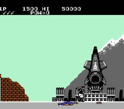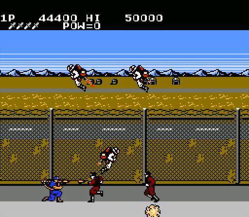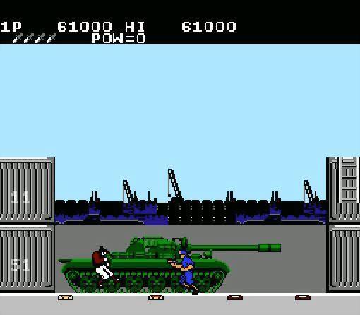 Assim que se dá uma olhada na capa do jogo é inevitável revirar os olhos nem que um pouquinho, no caso do bom entendedor do inglês e das circunstâncias históricas: é um trocadilho entre rushing (apressado) – que tem já o mesmo som de rush and (se apressar e…) – e “Russian”, Ataque dos Russos. Os jogos são conhecidos por, pelo menos antigamente, não serem abertamente políticos, mas eis aqui um exemplo de innuendo. Com efeito, nada dessa referência ianque patriota está na concepção original (a Konami é japonesa): o nome do jogo antes da transposição ao mercado estadunidense e europeu é Green Beret (boina verde), no Famicom Disk System. O conceito é: um soldado, solitário (ou acompanhado de um outro, no caso de uma partida multiplayer), é enviado a território inimigo com apenas uma faca militar como arma (!). O soldado deve percorrer 6 fases prenhes de inimigos e obstáculos, matando um chefe diferente de cada vez, tudo visando à desativação de uma arma secreta superpoderosa possuída pelo exército inimigo (a União Soviética). Esse último detalhe é mais uma hint de que eu não estou associando Metal Gear a RA por mero capricho! Ao longo do caminho o guerrilheiro pode apanhar armas de fogo também, e itens que dão-lhe algum refresco maior ou mais uma habilidade. Tem, p.ex., o rocket launcher, que dá 3 disparos horizontais, a granada, para explodir todos num determinado raio, e uma estrela que rende invencibilidade temporária (It’s me, Mario!). Se estiver jogando a dois, ambos se movem ao mesmo tempo e na mesma tela, o que é uma dinâmica surpreendentemente divertida para um conceito ainda tão reto e direto.