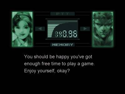 Bem mais de 10 anos depois do game ter saído, ainda dá para descobrir novas facetas toda vez que se inicia um novo story mode. Esse é o grande ponto forte da narrativa-gameplay (que a propósito são indissociáveis uma da outra em qualquer MGS), que de outra forma seria muito criticada pela sua brevidade (leva cerca de meia dúzia de horas para zerar Metal Gear Solid apesar da saga ser em 2 CDs, isso contando-se com 3 horas de FMVs!). Mais detalhes insólitos da gameplay, já que todo leitor gosta dessas coisas: se estiver fumando — O cigarro, de fato, é um dos itens do inventário não-bélico (e podiam ter pensado, ainda, na possibilidade de botar fogo num depósito de combustíveis com uma bagana ainda acesa, mas infelizmente isso não é possível…) que causam (realisticamente, de novo devo usar o termo) uma ligeira queda na barra de energia de Snake –, Naomi Hunter, a supracitada doutora responsável pela saúde do guerrilheiro, listará umas boas razões com respaldo na medicina moderna segundo as quais nosso herói jamais deveria colocar outro cigarro desses na boca; Solid Snake apenas redargüirá: “Você não sabe quão bom é dar umas tragadinhas pela manhã…”. Thumbs up para o respondão! Se isso parece irrelevante ou gratuito demais para ter sido incluído no jogo ou ser lembrado na matéria, que tal mais um trecho da gameplay, menos polêmico e decerto mais engraçado e insinuante? A dado ponto você precisa contatar uma certa mulher com seu rádio, mas não sabe seu número; dão-lhe somente uma dica: a de que o número está na parte de trás da caixa do CD. Você se pergunta que diabo de CD é esse e começa a procurar no seu inventário, depois no cenário, sempre sem sucesso… Mas então, qual é a solução do mistério? Sabe a caixa do jogo? Isso mesmo, a do seu Metal Gear Solid original (eu SEI que você NÃO comprou o piratão!)? É isso mesmo, é atrás DELA que está o número necessário! Esse sim é um golpe de gênio — simples, e no entanto vai deixar muita gente travada no jogo semanas a fio se não for cuidadosa o suficiente. Mais um detalhe pitoresco do jogo (eu não resisto): Mei Ling, seu “checkpoint” (você precisa telefoná-la via freqüência do rádio, como no exemplo anterior), é uma meiga colegial (pedófilos vibram igual um Dual Shock em plena atividade)!