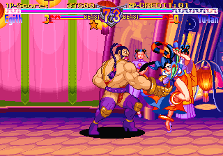 Os fundos dos cenários são gigantescos e detalhados, cheios de cores e variedade o suficiente. Há zoom-in e out nas lutas, o que ajuda a notar a grandiosidade do environment, sem necessariamente tirar o foco da ação. Os bonecos estão igualmente bem-representados pelos sprites e animações. Há ligeiras pixelizações nos zooms, mas nada tão evidente quanto em Waku Waku ou outros títulos que ousaram adotar a técnica nos 32-bit. Os lutadores e respectivos animais têm todo um feeling cartoon que casa muito bem com a estética e a gameplay propostas. Além de cada character ser único visualmente, é jogado de forma diferente. Os espíritos se parecem com o Gênio do Aladdin. A escolha não poderia ter sido mais feliz, justapondo-se com harmonia aos backgrounds. Se o jogo fosse “nota 8”, eu diria que os gráficos seriam “nota 9”, ou seja, são sem dúvida um atributo acima da média.