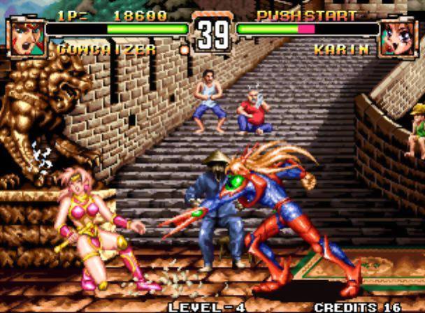 Significa que, dum ponto de vista básico, VFG soa bastante derivativo, sem originalidade. A verdade é que em termos de originalidade não temos um bom fighter como garantia. Art of Fighting foi bem original, mas é um jogo que sai devendo. Muitos prefeririam que fosse genérico mas apresentasse uma engine menos travadona e regrada. A parte mais original de Gowcaizer, que ajuda a montar um jogo de luta, está nos personagens. Apesar de poucos, são todos interessantes e únicos, divertidos de pegar e aprender a jogar. Apesar de conter um shoto character não há, fora esse, o que se chame de fighter arquetípico em VFG.