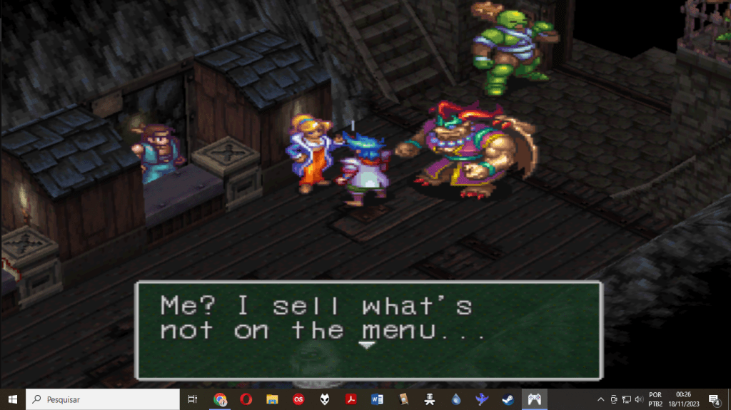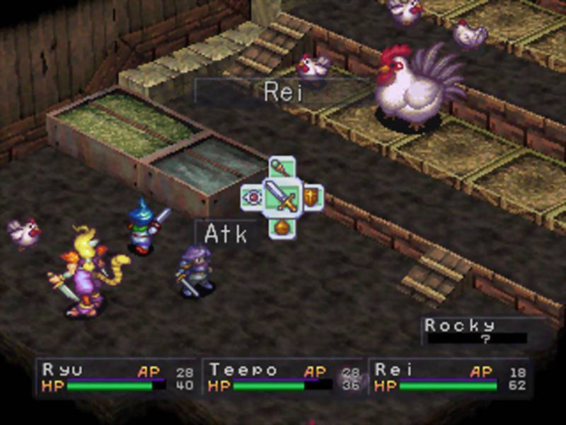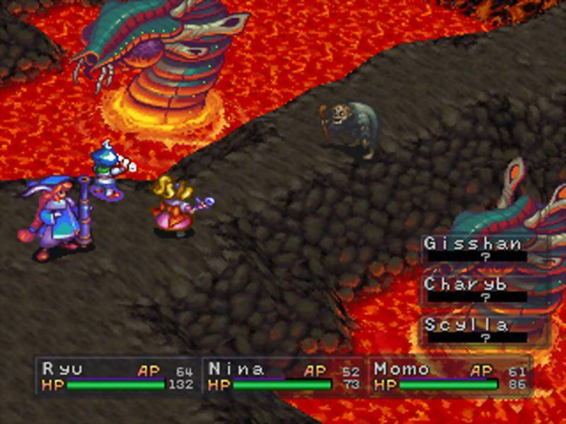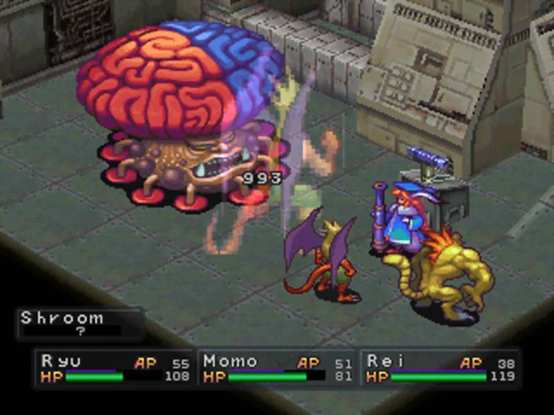 Final Fantasy pode ter sido um dos primeiros RPGs, mas esta série demoraria um pouco (algumas continuações) para apresentar equipes de personagens controláveis verdadeiramente coesas, onde os talentos individuais se completam harmonicamente em prol do coletivo. No BOF em tela este quesito foi devidamente atendido: sem sermos exaustivos na listagem, temos Rei, o ladrão-modelo, embora fisicamente fraco; Nina, com baixa defesa mas um poderoso ataque mágico; e Garr, lerdo que só ele e possuindo um ataque físico fenomenal. Momo, por exemplo, é uma cientista que está sempre falando do legado do pai também cientista e me lembra estranhamente Lucca (Chrono Trigger), que carrega dentro das vestes um pequeno, incrível e adorável robô chamado Honey. Dispomos ainda da cebola mutante (isso mesmo, uma cebola!) chamada Peco, que usa um idioleto vegano, se é para classificarmos de algum modo: “Wheep!”; “Psyku kyu pusyku?”, etc. Decerto concorre a prêmio de um dos personagens mais fofinhos da História.