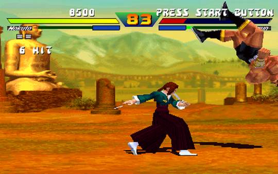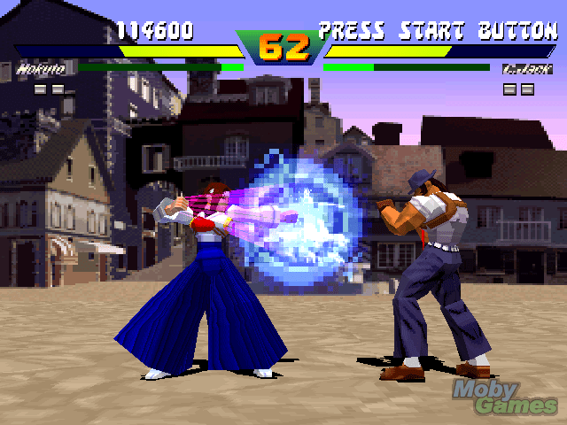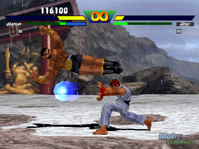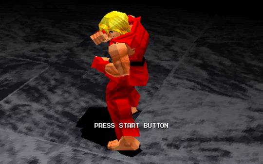 Acerca do sistema de jogo, muito raramente você pode trocar de plano, e jamais via side-stepping: Akuma/Evil Ryu (que têm os mesmos movimentos) fazem um Ashura Warp, Bison/Dhalsim executam teleporte e um ou outro character possuem moves correlatos. Então, na prática, a jogabilidade ainda é 2D, embora LENTA (não tanto quanto Virtua Fighter ou Tekken, é verdade). [Por falar em Tekken, em termos de número de polígonos empregados na construção dos modelos e cenários, EX Plus Alpha tem mais ou menos a mesma performance de Tekken 2, só que Tekken 2 tem texturas plenamente superiores, onde você não vê as linhas que constituem os bonecos! Quanto aos backgrounds de SFEXPA, eles são em 2D e radicalmente despidos de detalhes, dando-nos a maior saudade do Street Fighter II na velha e bolorenta CPS1…] Voltando a falar dos maiores atrativos da mecânica, nos Super Cancels, ao invés de pressionar soco forte (como em SF Zero 3) ou os três socos (Zero1&2) a fim de desempenhar um super combo de grau 3 (máximo), o esquema é executar um super de grau 1, emendá-lo, antes de acabar, com um super de grau 1 diferente, depois fazer mais um super de grau 1 do seu personagem antes que o segundo acabe, de forma que se crie um super combo de grau 3 “artificial”, ou “manual”. De dar calos nos dedos, mas uma engine capaz de deixar os mais freaks com a cabeça nas nuvens, só de imaginar quanta liberdade essa faceta permite!